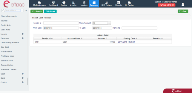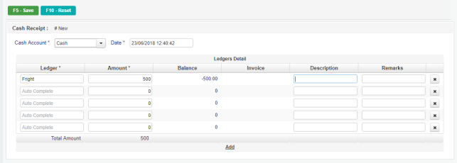 - To record cash receipt, Goto Accounts->Cash->Cash Receipt